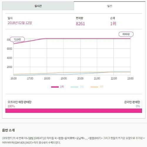 MOMOLAND, 12 Şubat’tan itibaren Hanteo’nun Günlük Müzik Listesi’ne bu ayın başlarında girmeye başladı. Hanteo Chart verilerine göre “Great!” bir günde 8,261 kopya sattı ve MOMOLAND’ın Ocak ayının ortalarından itibaren ki satışlarına nazaran tüm ay boyunca neredeyse iki katı satış yaptığı görüldü. Bu rakamlar, MOMOLAND’ın ajansı tarafından grubun müzik programlarındaki sıralamasını yükseltmek için sajaegi yaptığı yönündeki iddiaların alevlenmesine neden oldu.