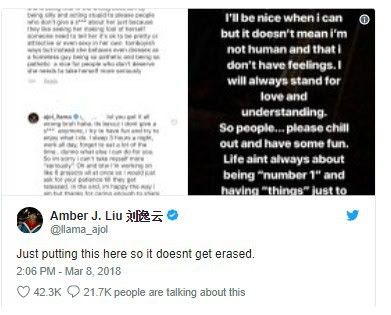 8 Mart’ta Amber, yorumu ve cevabının bir ekran görüntüsünü Instagram hikayesinde ve Twitter hesabında bir yazıyla paylaştı.