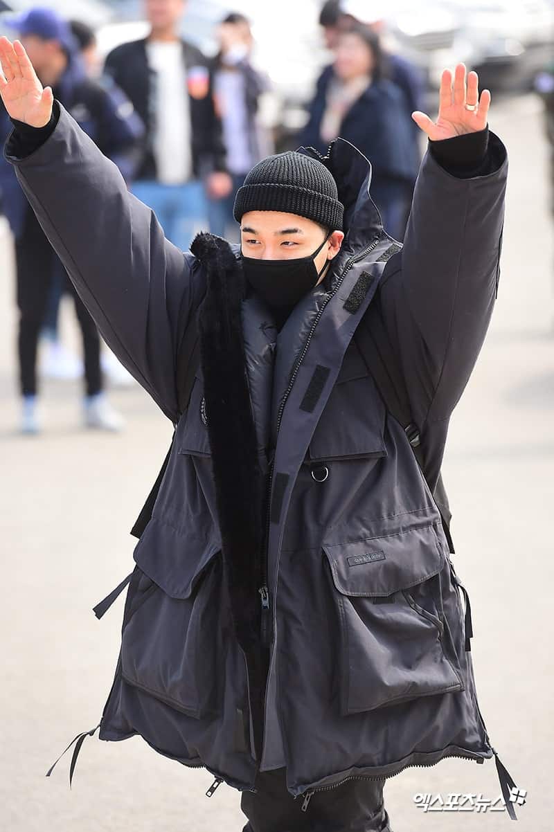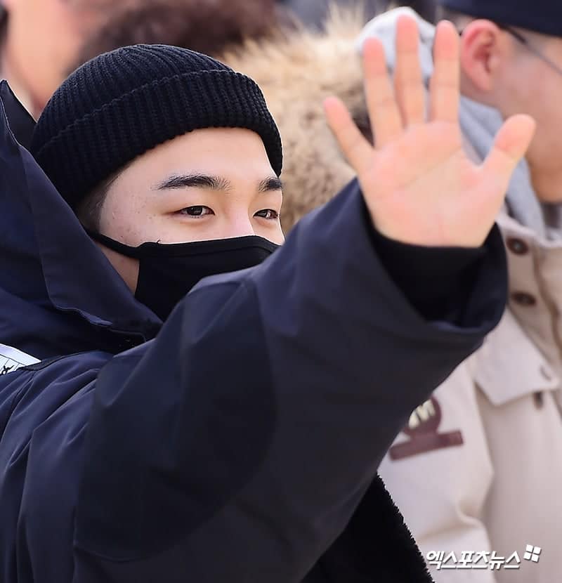 Girmeden önce, YG Entertainment personeline veda etti ve aynı zamanda bekleyen Koreli hayranlara ellerini salladı ve farklı dillerde konuşma yapan hayranları da selamladı.