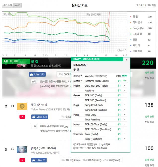 BIGBANG’ın “Flower Road” adlı parçası 14 Mart saat 12: 00’da yayınlandıktan yaklaşık bir gün sonra yerli müzik listelerinde sertifikalı all-kill yaptı.