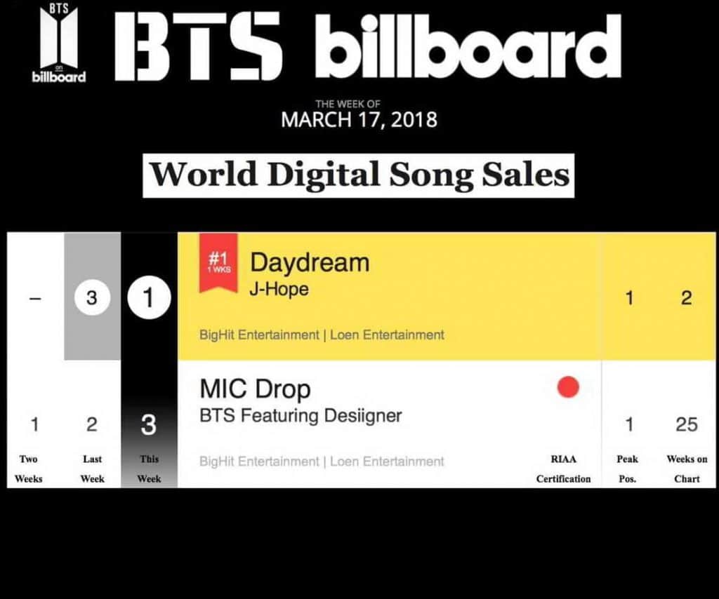 “Hope World” albümünün ana parçası olan “Daydream”, Dünya Dijital Şarkı Satışları listesinde zirvede yer aldı. Aynı listede BTS’in “MIC Drop (Steve Aoki Remix)” şarkısı da bize 3. sıradan göz kırpıyor.