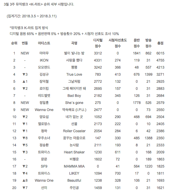 Bu haftanın galibi toplamda 6,015 puan ile MAMAMOO oldu. Böylece “Starry Night” müzik şovlarındaki dördüncü birinciliğini kazandı.