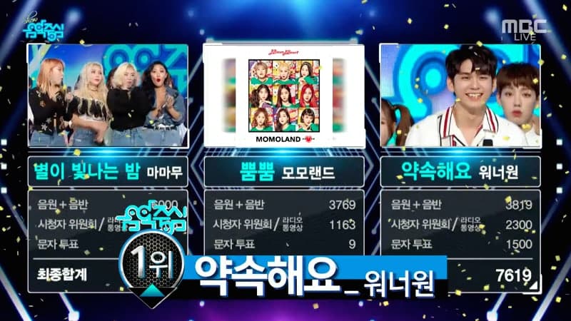 MAMAMOO, Momoland ve Wanna One 1.lik için aday oldu. Wanna One “I Promise You” ile kazanan oldu. Tebrikler Wanna One!