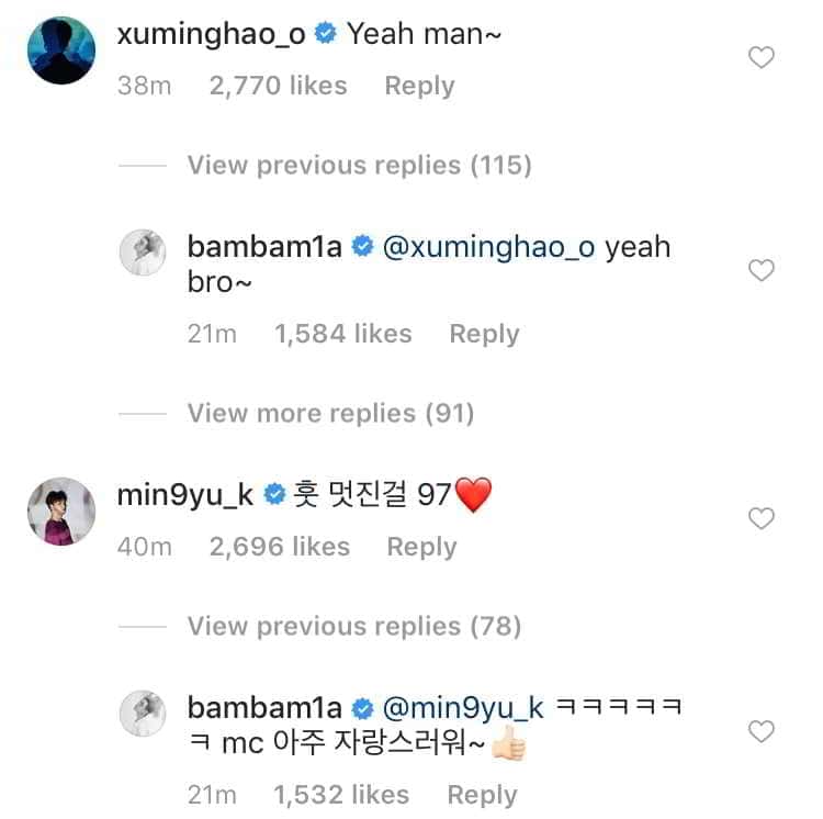 Bambam’ın gönderisinin altına The8 “Evet dostum~” şeklinde yorumda bulundu,Bambamda cevaplayarak “Evet kardeşim~” yazdı. Mingyu da kalpli “Biz çok iyiyiz,97” şeklinde yorum yazdı,Bambam’da “MC,çok gurur duyuyorum~” şeklinde yanıtladı