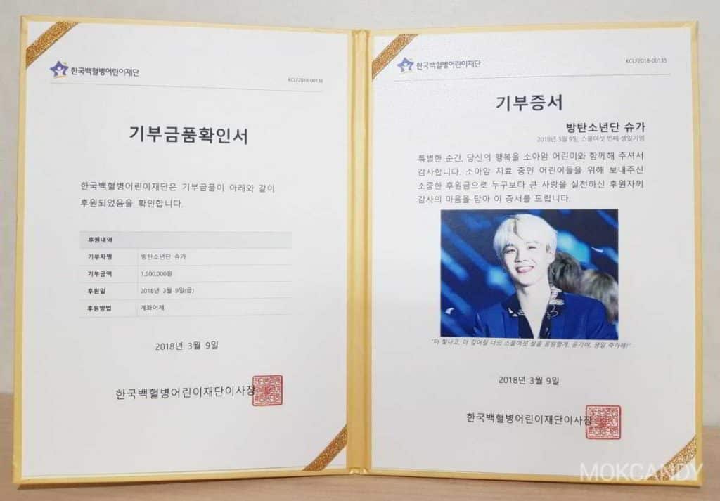 Kore Lösemili Çocuklar Vakfı, BTS’in hayran sayfası “Mokcandy”nin 9 Mart’ta Suga’nın 26. doğum günü şerefine vakfa bağışta bulunduğunu belirtti.