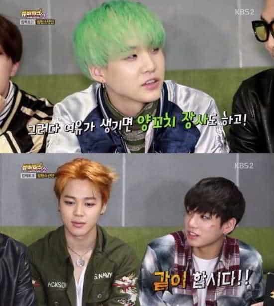 Jungkook’un kuzu şişe olan sevgisini ateşleyen Suga, onun kuzu şiş dostu. Jungkook, “Jeon-lusalri” (bir günlük uçuş) yanını göstererek Suga’dan korkmadığını kanıtlamıştı. Jungkook, yıl sonu ödül töreninde Daesang aldıklarında Suga’nın ağlamasını veya “FIRE”da çok ön plana çıktığı için editlenmiş olan Suga’nın sesini taklit etmişti. Çok fazla hareket etmemesiyle bilinen Suga’ya Jungkook ile oynamak ağır gelebilir ama konu Jungkook röportajı olduğunda derin bir şekilde odaklanan bir üyedir. Suga, “Jungkook’un bir yetişkine dönüşmesini izlemek çok tatlı. Röportaj yapmaya ilk başladığında anlatmak istediği noktayı güzelce özetleyemezdi ama artık net yanıtlar veriyor. Bunu izlemek bana tuhaf geliyor.” dedi. Geçen Daesang konuşmasında Jungkook da yer aldıktan sonra Suga, “Jungkook artık yetişkin oldu. Bu bana kendimi iyi hissettiriyor. Neden bu kadar iyi konuşuyor?” dedi Jungkook’un küçük bir çocuktan kendi boyunu geçen genç bir adama dönüşmesini izleyen gururlu bir anne edasıyla.