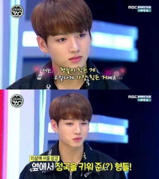 Bütün ARMYler Jungkook’un, “Benim için en zor anlar, abilerimin zor zamanlar geçirdiğini izlemek.” dediğinde tüm üyelerin birlikte ağladığı hikayesini bilir. BTS, MBC’nin “Star 360” adlı varyete programına çıktıklarında Jungkook, “15 yaşındayken stajyerliğe başladım. Neredeyse abilerim büyüttü beni. Abilerimin zor, duygusal zamanlardan geçtiğini görmek beni üzüyordu. Muhtemelen bu yüzden ağladım.” demişti.