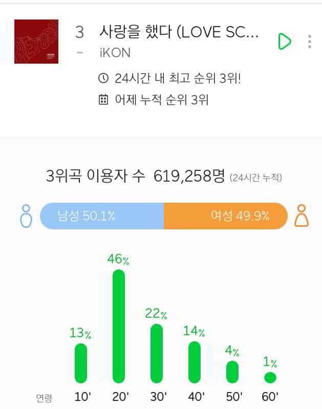 Şarkı 24 Mart‘da Melon’da sahip olduğu farklı dinleyici sayısı ve kadın-erkek dinleyicilerinin oranları ile k-pop severleri oldukça şaşırttı.