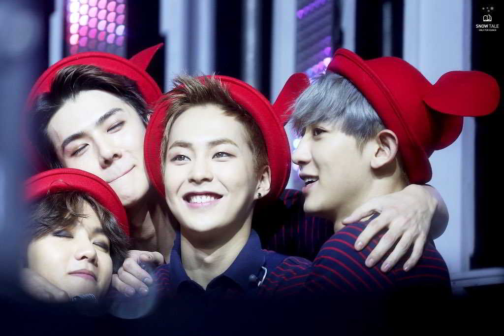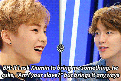 Baekhyun ve Xiumin ikilisi. Ah bu üyeler Baekhyun’dan çok çekiyor. Özellikle Umin. Her türlü isteği tatlı dille yaptırıp hyungunu kendine köle ettiren Baekhyun.