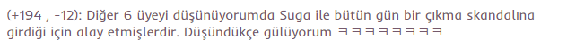 (+194 , -12): Diğer 6 üyeyi düşünüyorumda Suga ile bütün gün bir çıkma skandalına girdiği için alay etmişlerdir. Düşündükçe gülüyorum ㅋㅋㅋㅋㅋㅋㅋㅋ