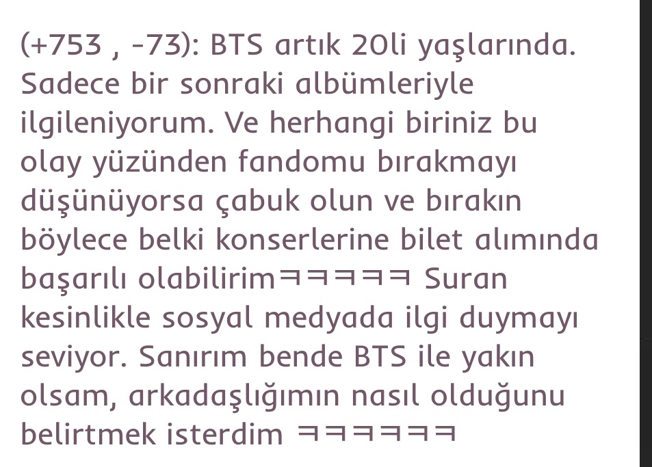 (+753 , -73): BTS artık 20li yaşlarında. Sadece bir sonraki albümleriyle ilgileniyorum. Ve herhangi biriniz bu olay yüzünden fandomu bırakmayı düşünüyorsa çabuk olun ve bırakın böylece belki konserlerine bilet alımında başarılı olabilirimㅋㅋㅋㅋㅋ Suran kesinlikle sosyal medyada ilgi duymayı seviyor. Sanırım bende BTS ile yakın olsam, arkadaşlığımın nasıl olduğunu belirtmek isterdim ㅋㅋㅋㅋㅋㅋ