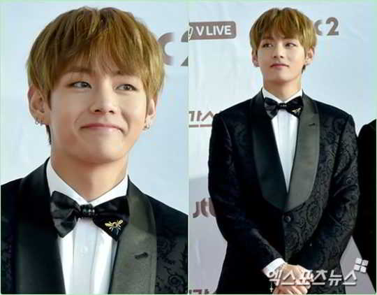 Fırfır, kurdele ve çiçek boyun aksesuarları V’yi romantik bir beyefendiye dönüştürüyor. Çiçek parçalarını ön plana çıkarmak için zıt olan pembemsi tonları kullanıyor. Sahneye çıktığında, fırfırlı görünümü ona bir prens karakteri havası veriyor.
