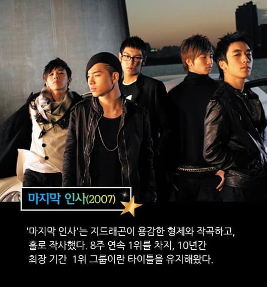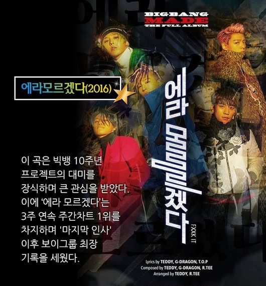 6.) [+201][-3] ‘Haru Haru’, ‘Heaven’, ‘Blue’, ‘Loser’, ‘Bae Bae’, ‘If You’, vb…ve solo çalışmalar: ‘Heartbreaker’, ‘Crooked’, ‘Untitled’, ‘Only look at me’, ‘I need a girl’, ‘Eyes Nose Lips’, ‘Strong Baby’, ‘Look at me Gwisoon’, vb ㅋㅋㅋㅋ Cidden bir çok şey var… bir sanatçının 13 yıldır hit şarkıları sürekli yayınlaması nadirdir