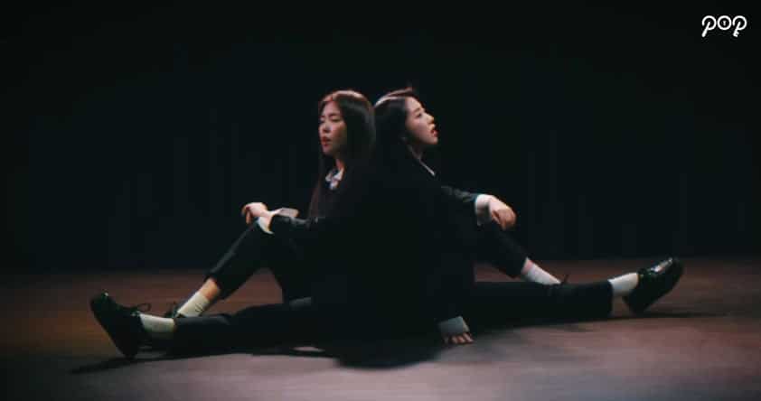 İki kız grubu üyesi takım elbise içinde uyumlu bir halde şarkıyı coverlıyor