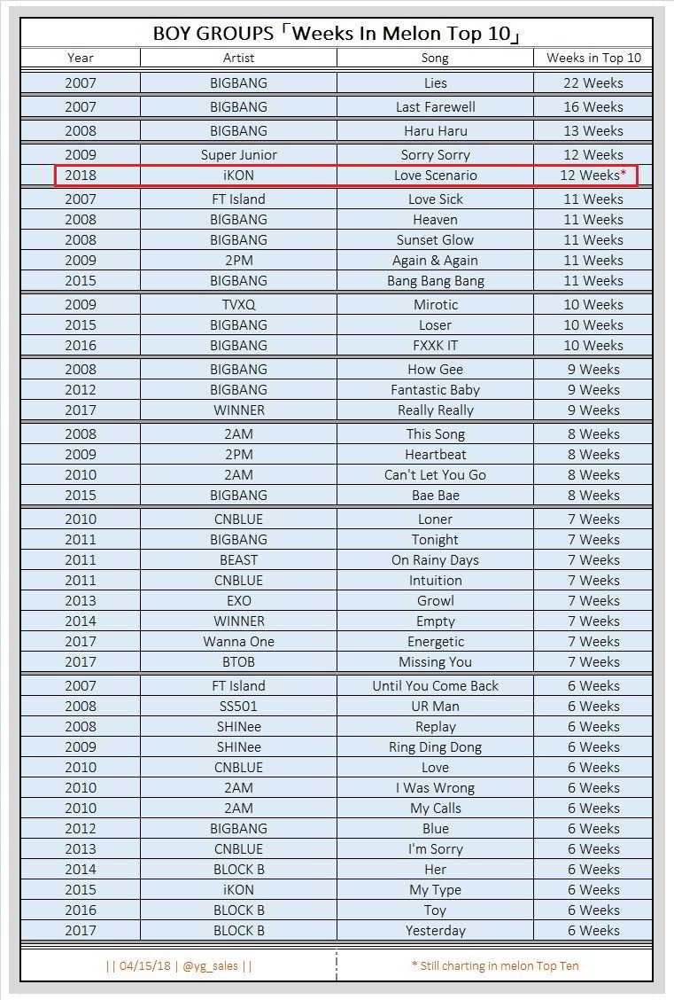 [INFO] With 12 weeks, ‘LOVE SCENARIO’ by iKON is the song by a K-pop boygroup that has spent the most number of weeks at the MelOn’s Top 10 in this decade.