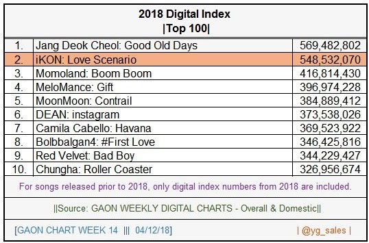iKON’un ‘Love Scenario’ parçası, Jang Deok Cheol‘un “Good Old Days” şarkısı 2017 senesinde yayımlandığından dolayı, 2018 yılında yayımlanan parçalar arasında da en yüksek dijital indekse sahip şarkı olmayı sürdürüyor.