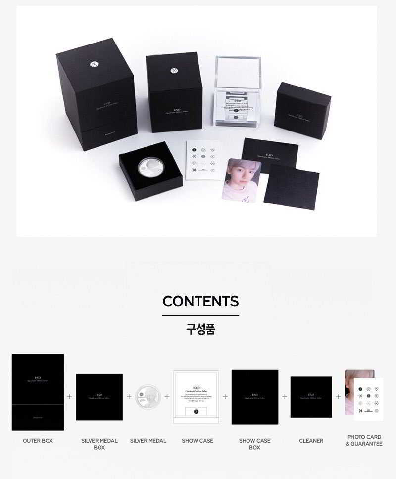 EXO‘nun, Kore Ulusal Darphanesi tarafından yapılan özel hatıra madalyaları bugün satışa sunuldu. Satışa çıkan ve fiyatı 1,458,000 Won (1378 Dolar) madalya seti 1 saat içinde tükendi.