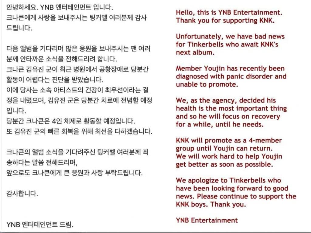 YNB şirketi KNK’nin fan sitesinden Youjın’e panik atak teşhisi konduğunu ve grubun promosyonlarına katılamayacağı hakkında resmi bir açıklama yayınladı.