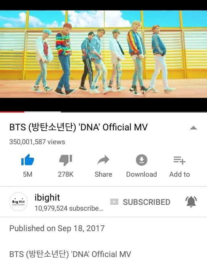 Pazar günü yedi üyeli grubun “DNA” klibi, 348 milyon izlenmeye ulaşarak BIGBANG’in “Fantastic Baby” klibinin izlenme sayısını geçerek en çok izlenen K-Pop grubu klibi oldu. “Fantastic Baby”, en çok izlenen K-Pop grubu klibi unvanını uzun zamandır elinde tutuyordu.