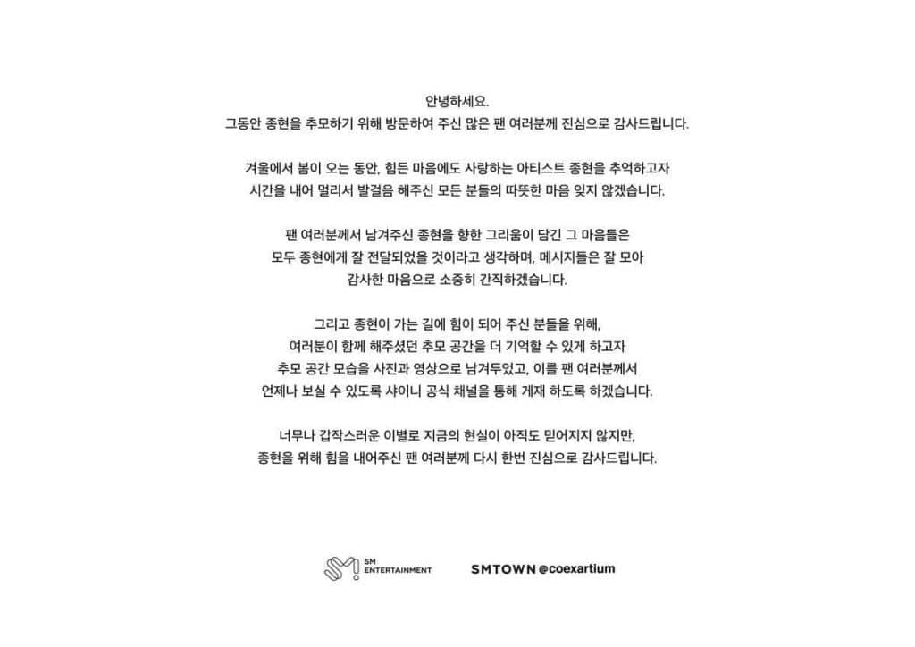 SM Entertainment SHINee Jonghyun’un anma salonunu kapattıktan sonra resmi bir bildiri yayınladı.
