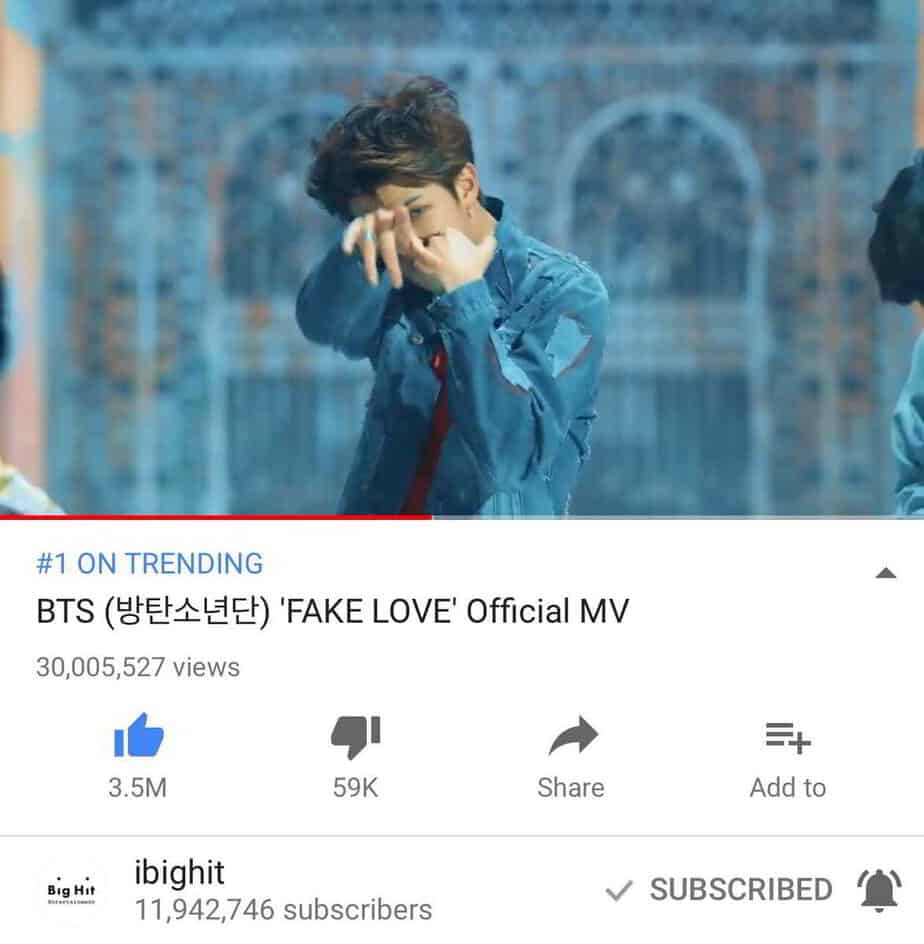 “FAKE LOVE” kırdığı rekor ile YouTube tarihinde en hızlı 30 milyon izlenmeye ulaşan klip olabilir ancak bunu doğrulayabileceğimiz yeterli resmi kaynak bulunmamakta.