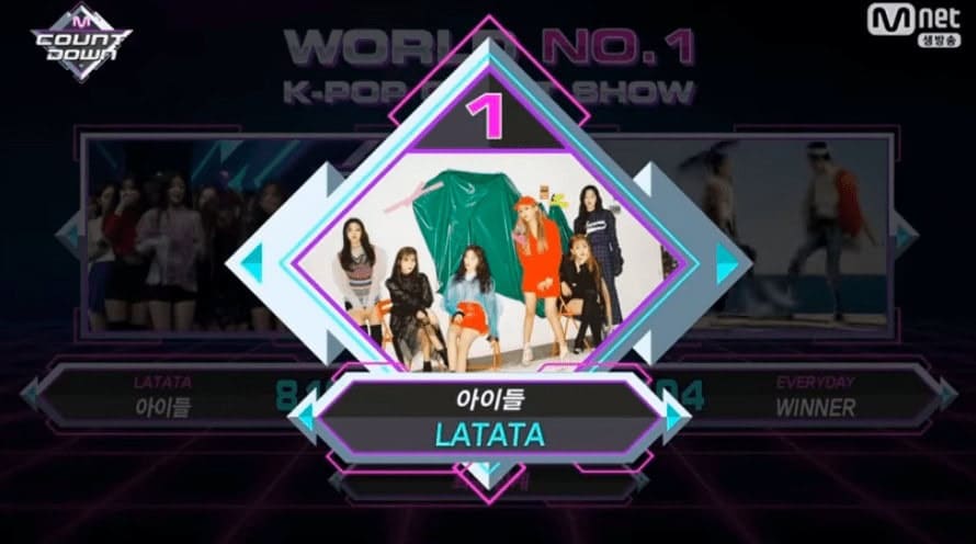 “M!Countdown”un 24 Mayıs’taki bölümünde (G)I-DLE’dan “LATATA” ve WINNER’dan “Everyday” 1.lik için adaydılar. (G)I-DLE 8,183 skorla kazanan olurken WINNER 7,394 skorla 2.oldu.