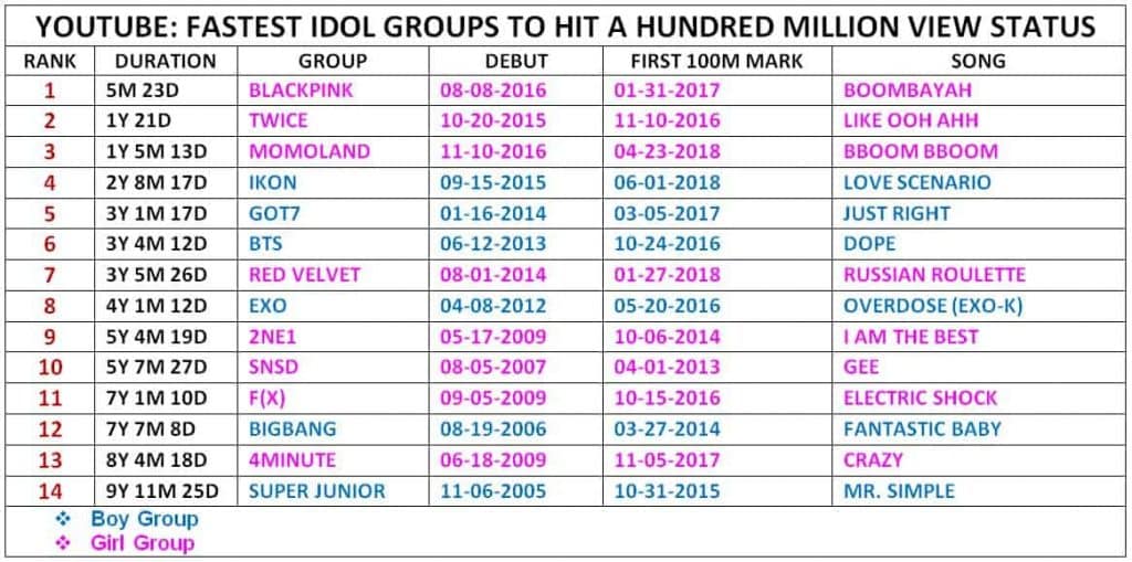 Black Pink tüm gruplar arasında ‘Boombayah‘ şarkısıyla çıkışından yalnızca 6 ay sonra 100 M görüntülenmeye ulaşarak en hızlı elde etme rekorunu elinde tutuyor. Onun ardından Twice ve Momoland takip ediyor.