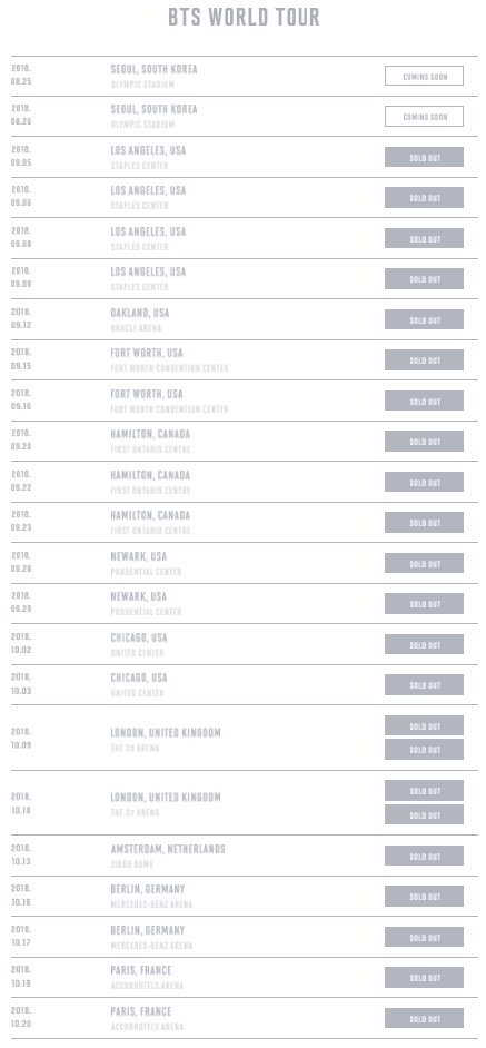 BTS’in dünya turu “LOVE YOURSELF”, 25-26 Ağustos tarihlerinde Seul’deki Jamsil Olimpik Stadyum’da başlayacak. Daha sonrasında Los Angeles, Oakland, Fort Worth, Hamilton, Newark, Şikago, Londra, Amsterdam, Berlin ve Paris’te devam edecek. Başka tur durakları da ileriki zamanlarda duyurulacak.
