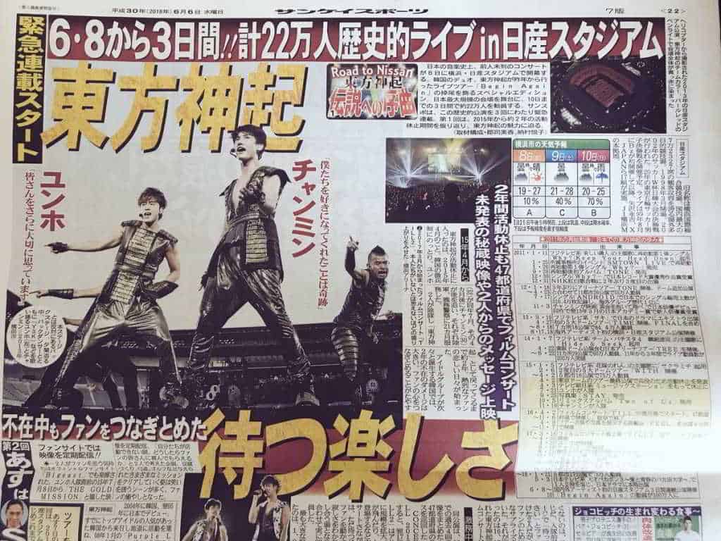 Japon Sanspo gazetesi, TVXQ’nun yaklaşan Nissan konseri haberini, “Sarsılmayan güven”, “TVXQ’nun yapamayacağı hiçbir şey yok”, “En büyük eser onların var oluşları” başlıklarıyla payalştı.