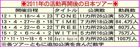 Grubun yola iki kişi devam etmesinin ardından Japonya’da ilk turu TONE(2012) ile 11 şehirde 26 performansla 550,000 seyirciyi; TIME(2013) ile 7 şehirde 18 performansla 844,000 seyirci; TREE(2014) ile 11 şehirde 29 performansla 600,000 seyirci; WITH(2015) ile 5 şehirde 16 performansla 750,000 seyirciyi bir araya getirdi. 2017’de Kasım’da başlayan Begin Again turu ile ise 6 şehirde yalnızca 20 performansla 1,000,000’dan fazla seyirciyi bir araya getiriyor. Bu, 5 yılda 3,744,000 seyirci demek oluyor. Grubun ayrıca askerde olduğu sürede gerçekleşen ‘film konserleri’ne ve verdikleri konserlere ek olarak aynı anda tiyatro salonlarında canlı yayınlanan konserlerine katılımcı sayısı da 1 milyonu geçmekte.