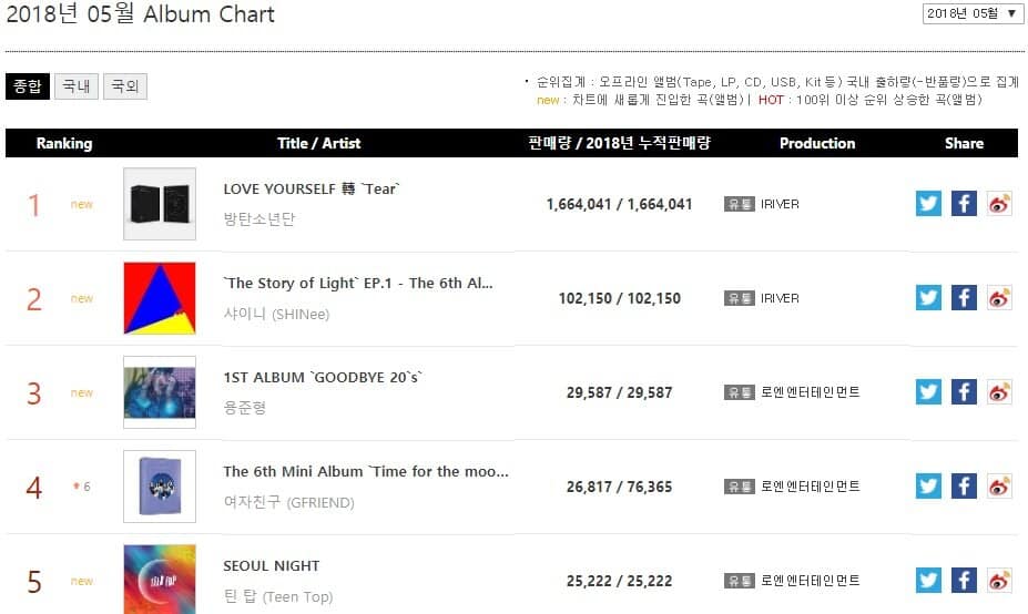 BTSin yeni albümü “LOVE YOURSELF Tear ” aylık albüm listesinde fiziksel albüm kayıtlarında kısa sürede büyük oranda satış yaparak 1,664,041 albüm gönderisiyle en üst sıraya yerleşiyor. SHINee‘nin beklenen albümünün 1.kısmı “The Story of Light EP.1” 102,150 albümle 2. sıradayken, Highlight’dan Junhyung “Goodbye 20’s” ile 26,817 albüm satışıyla 3. sırada yer alıyor.