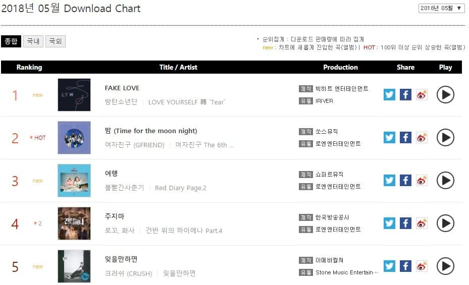 Mayıs ayının indirme listesinde BTS’in “Fake Love” parçası en üst sıradayken onu GFRIEND “Time For The Moon Night” ile takip ediyor. Bolbbalgan4 “Travel” ile 3.sıraya yerleşerek TOP3’ü tamamlıyor.