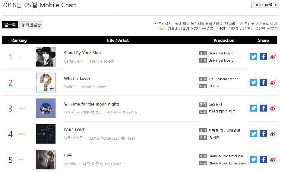 Fransız şarkıcı Carla Bruni‘nin “Stand By Your Man” şarkısı geçen ay olduğu gibi Mayıs ayı mobil listesinin yine en üst sırasında zirvedeki yerini korumaya devam ediyor. Ardından TWICE’ın “What Is Love?” parçası ile yine aynı şekilde 2. sıradaki yeri değişmezken, GFRIEND “Time For The Moon Night” ve BTS “Fake Love” ile listeye yeni giren sanatçılar olarak 3. ve 4. sıraya yerleşiyorlar.