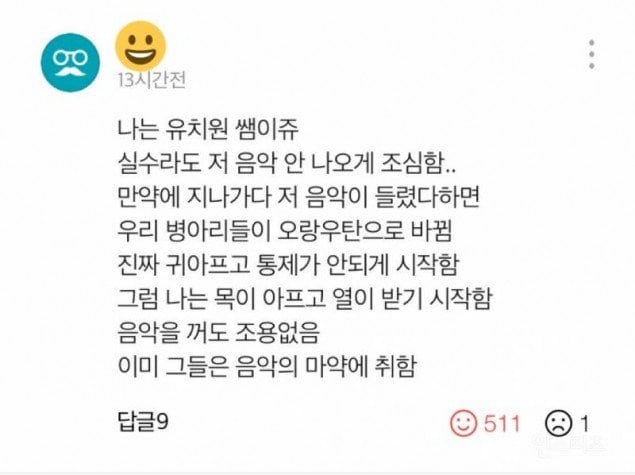 “Ben bir anaokulu öğretmeniyim. Kaza olsa bile, o şarkıyı çalmamaya çalışıyorum (“Love Scenario”). Eğer o şarkı çocukların etrafında çalarsa, küçük civcivler aniden orangutanlara dönüşür. Kulaklarım ağrımaya başlıyor ve çocuklar kontrol edilemez hale geliyorlar. Boğazım ağrıyor ve başım yanmaya başlıyor. Şarkıyı kapattıktan sonra bile sessizlik yok. Onlar zaten bağımlılık etkisi yaratan şarkıya maruz kalıyorlar.” [+511, -1]