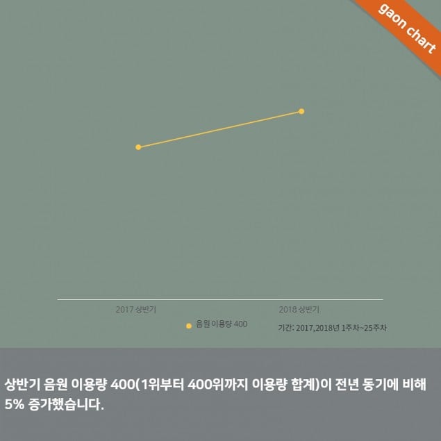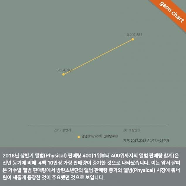 2017’nin ilk yarısındaki en iyi 400 albümün toplamı 6,054,783 albüm satışına ulaşmıştı. Bu sayı, bu yılın aynı dönemine göre 4,1 milyon daha fazla arttı. 2018’in ilk yarısındaki ilk 400 albümün toplamı 10.207.883 adet albüm satışına ulaştı.