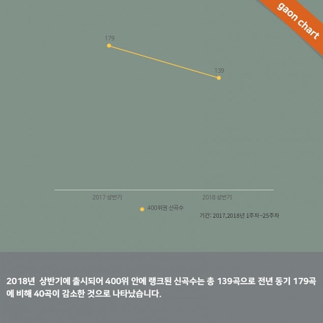2017’nin ilk yarısındaki en iyi 400 şarkıdan 179’u, 2017’de piyasaya sürülen yeni şarkılardı. Bununla birlikte, 2018’in ilk yarısındaki ilk 400 şarkının sadece 139’u, 2018’de piyasaya sürülen yeni şarkılardan oluşuyor.