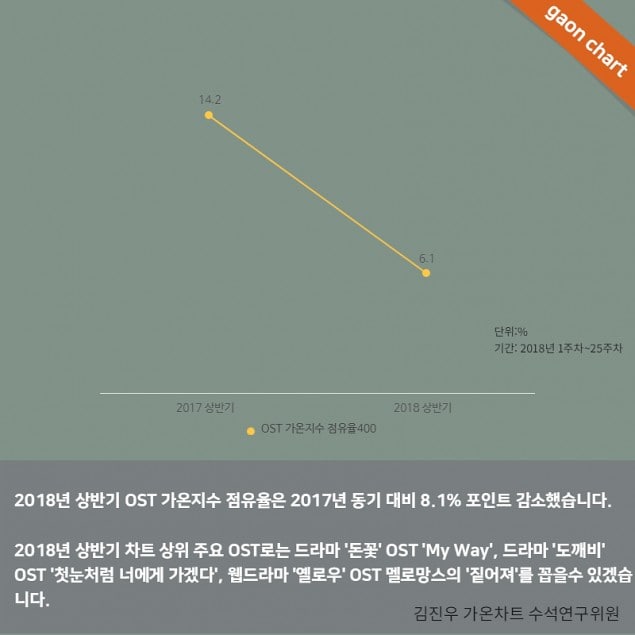 2018’in ilk yarısındaki en iyi 400 şarkıdan, şarkıların %6,1‘i OST idi. 2017’nin ilk yarısındaki en iyi 400 şarkının %14.2’si OST idi ve bu, sert bir düşüş oldu.