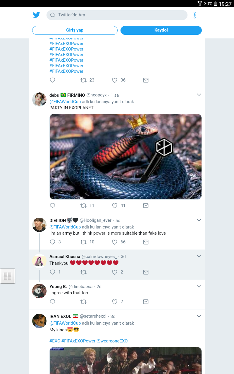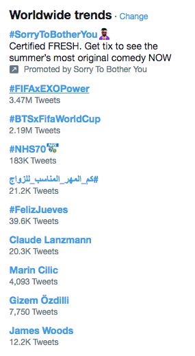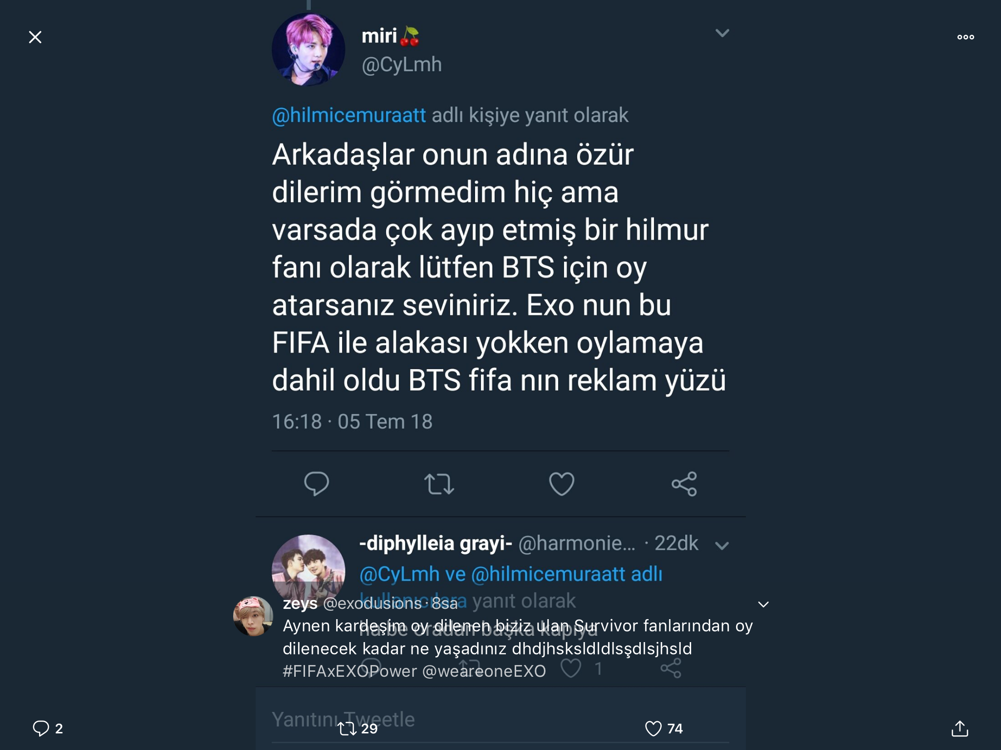 4 Temmuz’da ‘FIFA Dünya Kupası’, Twitter’da “Stadyumun içinde hangi ritmi duymak istiyorsunuz?” sorusuyla bir anket başlattı. Anketteki en iyi 4 aday BTS Fake Love, EXO Power, J Balvin Mi Gente ve Zedd The Middle. Ankette K-pop sanatçılarının hakimiyeti sürüyor. Aslında #FIFAxEXOPower ve #BTSxFIFAWorldCup anket boyunca twitterda dünya trendlerinde üst sıralarda yerlerini koruyup K-Pop fanlarının muhteşem gücünü gösterdi.
