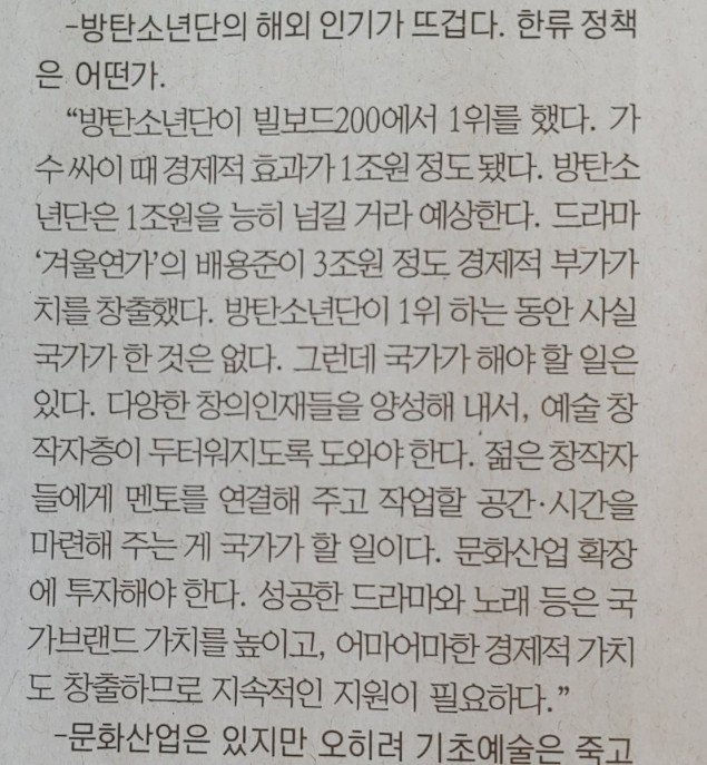“PSY aktifken ekonomik etkisi yaklaşık 1 trilyon won (896 milyon dolar civarında) değerindeydi. BTS’in 1 trilyon wonu kolayca geçeceğini tahmin ediyorum. Winter Sonata dizisi üzerinden Bae Yong Joon, yaklaşık 3 trilyon won ekonomik değer taşımıştı. Ancak BTS Billboard’da birinci olduğunda ulus hiçbir şey yapmadı. Yani ulusun yapması gereken bir şeyler var. Ülkenin yaratıcı yetenekleri teşvik etmesi ve yaratıcı sanatçı tabakasını kalınlaştırmaya yardım etmesi gerekiyor. Ulus, genç bireyleri doğru akıl hocalarıyla birleştirmeli ve işlerini doğru bir şekilde yapmaları için onlara gerekli zaman ve alanı sağlamalı.”