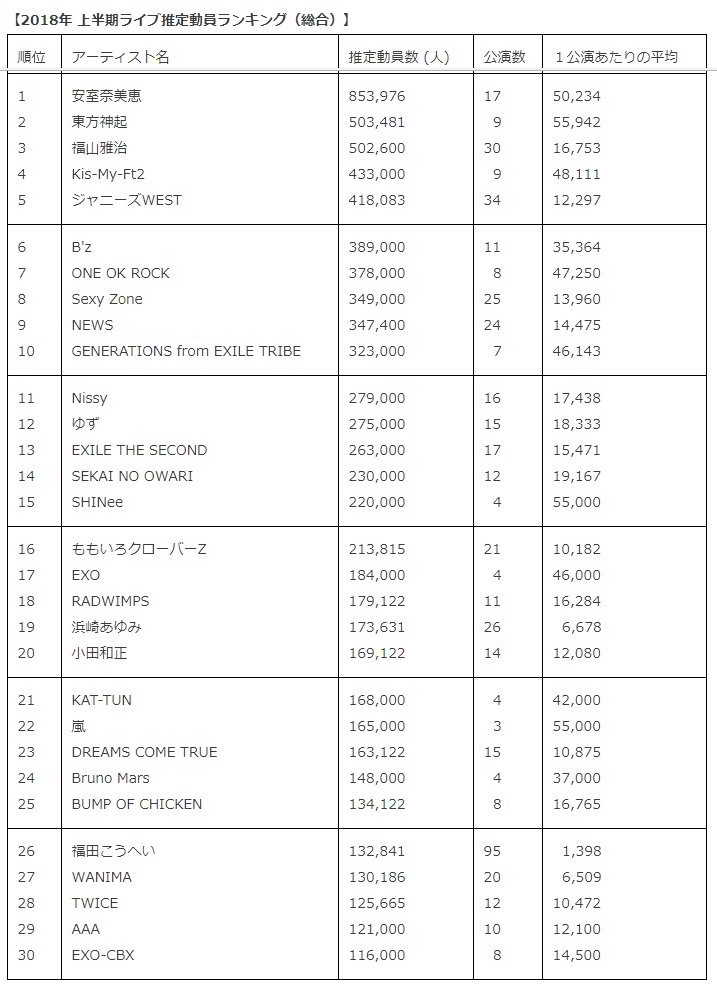 2018’in ilk yarısında Japonya’da gerçekleşen konserlerin katılımcı sayıları ve konser başı ortalama katılımcı sayıları duyuruldu. Sıralama bilet satışları baz alınarak yapıldı.