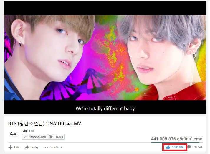 BTS’in 18 Eylül 2017 tarihinde ibighit kanalında yayımlanan “DNA” klibi, 22 Temmuz’da 14:10 civarında 6 milyon beğeniye ulaştı. Böylece grubun 18 Mayıs 2018’de yayımlanan “FAKE LOVE” şarkısının ardından 6 milyon beğeniye ulaşan ikinci şarkısı oldu. Ayrıca şu anda YouTube’da 6 milyon beğeniye sahip klibi bulunan tek K-Pop grubu da BTS.