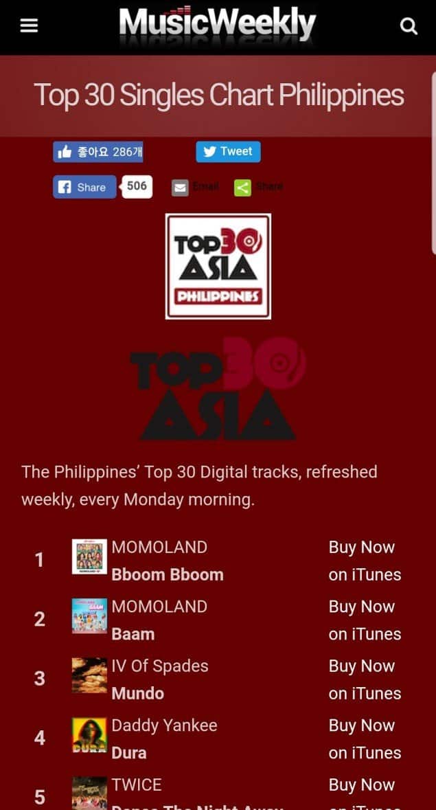 Grubun “Bboom Bboom” ve “BAAM” şarkıları Filipinler “Music Weekly Top 30 Single” listesinde 1. ve 2. sırayı aldı. Filipinli ünlüler programlarda “BAAM” ile dans ediyorlar bu da grubun ülkede çok sevildiğini gösteriyor.