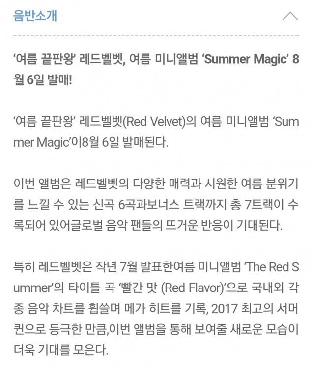 Online CD satıcısına göre, Red Velvet çok yakında yaz mini albümleri “Summer Magic” ile geri dönüş yapacak. Yeni mini albümde 6 yeni şarkı ve bir bonus şarkı bulunacak. Şarkı için geçen sene ki “Red Flavor” tadında, fırtına estirecek bir şarkı yorumları yapılıyor.
