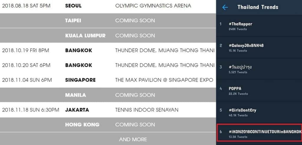 iKON Tayland’ın başkenti Bangkok‘da iki gün üst üste konser verecek. Tarihlerin açıklanmasıyla grup kısa sürede Tayland’ın Twitter gündeminde #iKON2018CONTINUETOURinBANGKOK etiketiyle trend oldu.