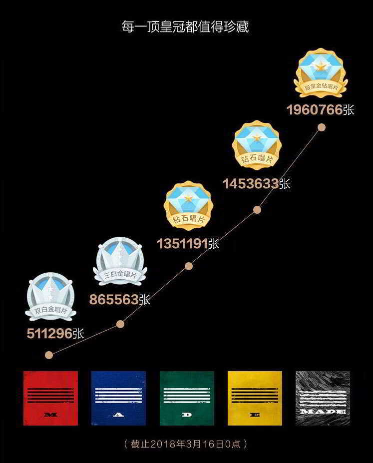 MADE serisinden ‘D’ ve ‘E’ albümleri, ‘ MADE The Full Album’ albümü, G-Dragon solo albümü ‘ Kwon Ji Yong’ ve Flower Road bir milyonun üstünde kopya sattı. Bigbang, Çin’de ki popülerliklerini bir kez daha tescillemiş oldu.