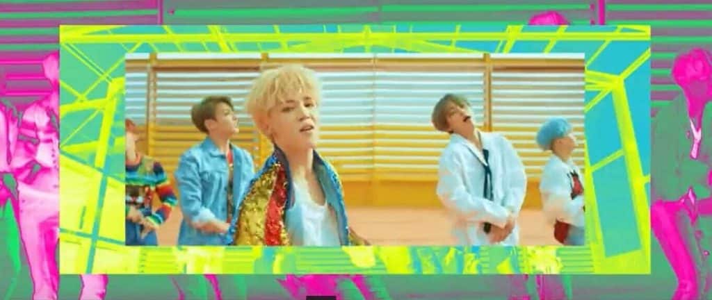 “Fake Love”, doğrudan “Singularity”yi takip ederken estetik ve tematik olarak genişleyen BTS Evreniyle devam ediyor. BTS Evreni, “birbiriyle ilişkili çeşitli karakterler ve onların hikayelerini içeren kurgusal kompleks bir dünya”nın yorumu olarak tanımlanan (Jenkins, 2007) medya üzerinden hikaye anlatıcılığının bir örneği. “Fake Love”da ilişkin renk paletleri, tekrarlayan hareketler, etraflı sinematografi ve kurgu tarzında görülebilen “DNA” (2017) ve “Blood, Sweat and Tears”a doğrudan görsel göndermeler bulunmakta. BTS’in diğer kliplerinde olduğu gibi “Fake Love” da izleyicileri, pasif alıcılar yapmak yerine aktif anlam üreticileri olarak harekete geçiriyor. Jenkins, “Bir dünya yaratma süreci, hem okuyucularda hem de yazarlarda ansiklopedik dürtüyü uyandırıyor.” diye yazıyor. “Bizim kavrayışımızın ötesinde hep genişleyen bir dünya” ve (çözümünde) ustalaşma girişimlerimizi savuşturuyor. Paradoksal olarak belki de içerikteki keyif, haritayı oluşturmadaki yetersizlikte ve bu dünyayı kontrol etmekte yatıyor (Jenkins, 2007). “DNA” ve “Fake Love” (ve tabii ki “Blood, Sweat and Tears”) arasında açık bir metinlerarası ve metatextual* bir ilişki var. Çerçeve içinde çerçeve ve mekan içinde mekan kullanımı aşağıda görüldüğü üzere “DNA”de, karışıklık ve bir bağlam içindeki kimliğin yansıması olarak görülebilir ki bu da BTS’in sanatını gözler önüne seriyor. “DNA”, yayımlandığı zamanda göründüğü gibi ideal romantik aşkın lirik bir gösterimi değil. Bunun yerine klibi, ataerkil ayrıcalığın sürdürülmesi ve heteronormativitenin* pekiştirilmesiyle yakından ilgili olan Güney Kore’deki popüler ve siyasi söylemlerde romantik aşkın çizimine yönelik bir eleştiri olarak yorumlayabiliriz.
