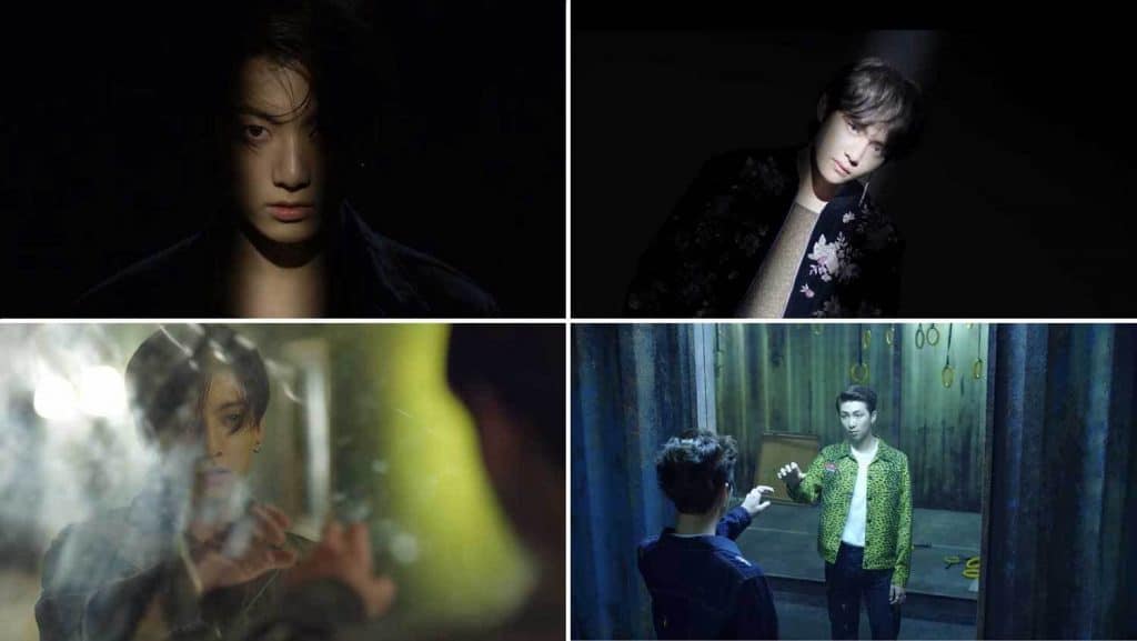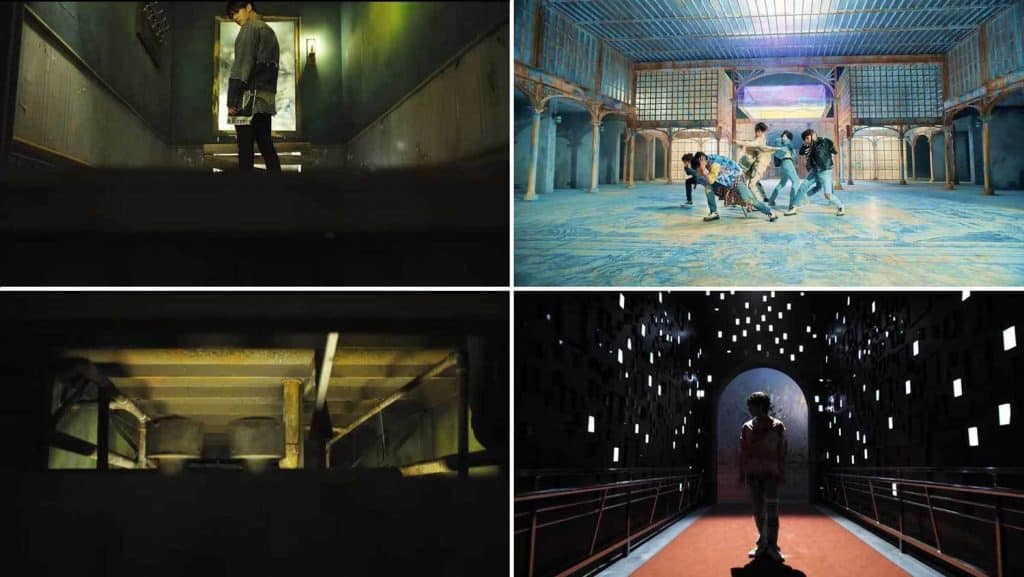 Performans evresi çoğunlukla canlı ana renkleri kullanarak ışıl ışıl parlarken öykü dünyasının mekanları tipik bir şekilde daha az canlı ve ton olarak daha koyu ki bu, üstteki ekran görüntülerinde de görülebilir. Jungkook, çökmekte olan zeminin üstünde koşuyor; kamera ise yalnızca cep telefonlarından gelen yapay ışıkla aydınlanmış Taehyung’un durduğu en alt seviyeye ulaşana kadar aşağı kayıyor. Kapı aralığındaki duvara “Save Me” (Kurtar Beni) yazılmış ki bu da bir yandan “Fake Love”ın öykü alanına gönderme yaparken diğer yandan da BTS’in 2016 yapımı tekli ve müzik videosu “Save Me”ye doğrudan bir gönderme yapma işlevi görüyor. Böylelikle BTS Evreninin genişlemesi devam ediyor. Mekan organizasyonu, birleşmiş benliğin kutsallığını sarsmaya ve sembolün yansıtıcı aynasını parçalara ayırmaya çalışıyor.