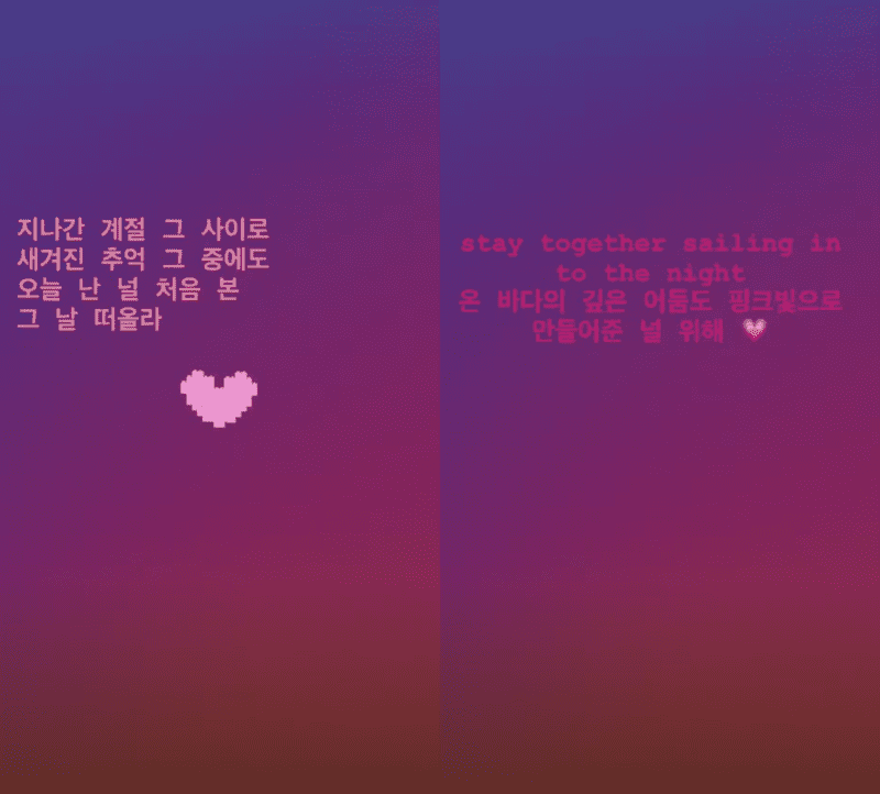 Taeyeon, önceki günkü tatlı mesajının dışında Instagram hikayesinde Girls Generation’ın “Sailing (0805)“ adlı şarkısını söylemesini ve “Gelip geçen mevsimler arasında unutulmaz anıların arasında seni ilk gördüğüm o günü hatırlıyorum. Birlikte kalalım, geceye doğru yol alırken senin için tüm denizdeki karanlığı pembeye dönüştürebilmiş olarak.” sözlerini yayınladı.