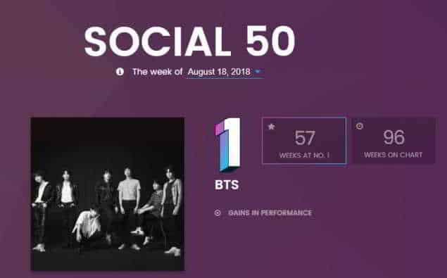 Genel kapsamda ‘Social 50’ listesinde 1. sıraya en çok ulaşan isimlerin arasında ilk olarak toplamda 163 hafta ile Justin Bieber geliyor ve onun ardından ikinci sırada BTS yerini alıyor.