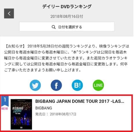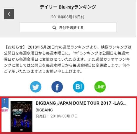17 Ağustos’ta yayınlanan grubun “BIGBANG Japan Dome Tour 2017 – Last Dance – : The Final” hem Oricon’un günlük DVD’sinde hem de Blu-Ray grafiklerinde (16 Ağustos tarihli) 1. oldu.